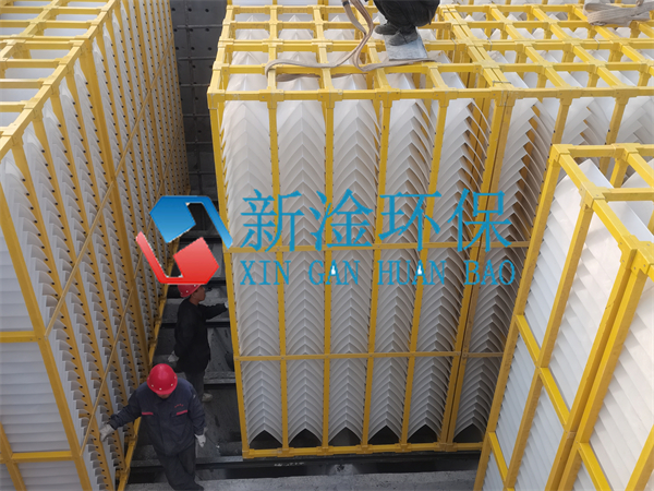 從下圖可以看到A型斜板以積木式組合裝配方式疊放在一起,從一側(cè)進水而另一側(cè)出水,兩排側(cè)向流A型斜板中間用擋水板擋住,內(nèi)部形成封閉的泥區(qū)。